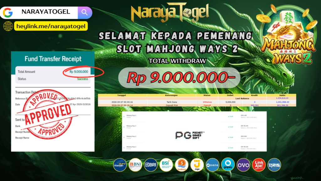 Selamat kepada User id SOP** Telah berhasil mendapatkan kemenangan besar pada permainan SLOT MAHJONG WAYS 2 Dengan kemenangan Sebesar Rp 9.000.000 Setelah mengisi formulir withdraw dengan kurang waktu hanya 1 – 10 menit pihak NARAYATOGEL sudah melakukan transfer kepada pemiliknya dan dana sudah masuk ke rekening id tersebut oleh pemenang. Bukti pembayaran yang kami berikan merupakan bukti pembayaran yang SAH / VALID yang langsung di dapatkan melalui tanda transfer transaksi berhasil dari Bank yang di tuju.