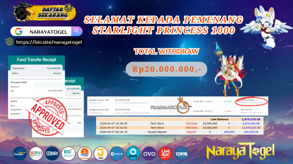 Selamat kepada User id LEOP** Telah berhasil mendapatkan kemenangan besar pada permainan SLOT STARLIGHT PRINCESS 1000 Dengan kemenangan Sebesar  Rp 20.000.000 Setelah mengisi formulir withdraw dengan kurang waktu hanya 1 – 10 menit pihak NARAYATOGEL sudah melakukan transfer kepada pemiliknya dan dana sudah masuk ke rekening id tersebut oleh pemenang. Bukti pembayaran yang kami berikan merupakan bukti pembayaran yang SAH / VALID yang langsung di dapatkan melalui tanda transfer transaksi berhasil dari Bank yang di tuju.