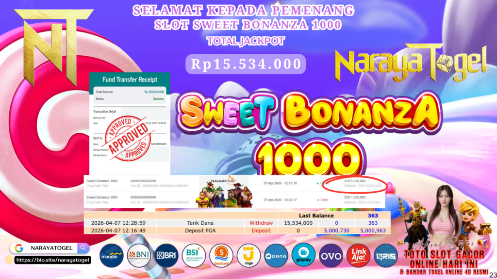 Selamat kepada User id KIKI** Telah berhasil mendapatkan kemenangan besar pada permainan SLOT SWEET BONANZA 1000 Dengan kemenangan Sebesar Rp 15.534.000 Setelah mengisi formulir withdraw dengan kurang waktu hanya 1 – 10 menit pihak NARAYATOGEL sudah melakukan transfer kepada pemiliknya dan dana sudah masuk ke rekening id tersebut oleh pemenang. Bukti pembayaran yang kami berikan merupakan bukti pembayaran yang SAH / VALID yang langsung di dapatkan melalui tanda transfer transaksi berhasil dari Bank yang di tuju.