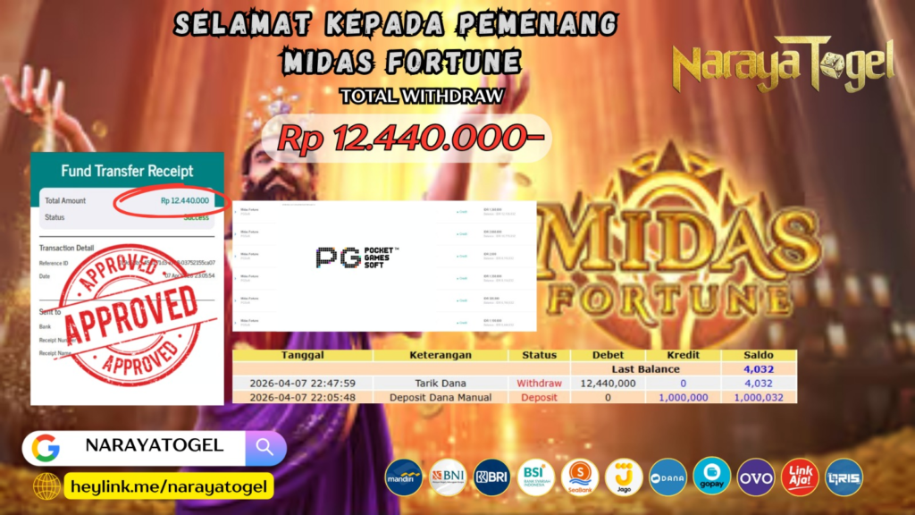 Selamat kepada User id DER** Telah berhasil mendapatkan kemenangan besar pada permainan MIDAS FORTUNE Dengan kemenangan Sebesar Rp 12.440.000 Setelah mengisi formulir withdraw dengan kurang waktu hanya 1 – 10 menit pihak NARAYATOGEL sudah melakukan transfer kepada pemiliknya dan dana sudah masuk ke rekening id tersebut oleh pemenang. Bukti pembayaran yang kami berikan merupakan bukti pembayaran yang SAH / VALID yang langsung di dapatkan melalui tanda transfer transaksi berhasil dari Bank yang di tuju.