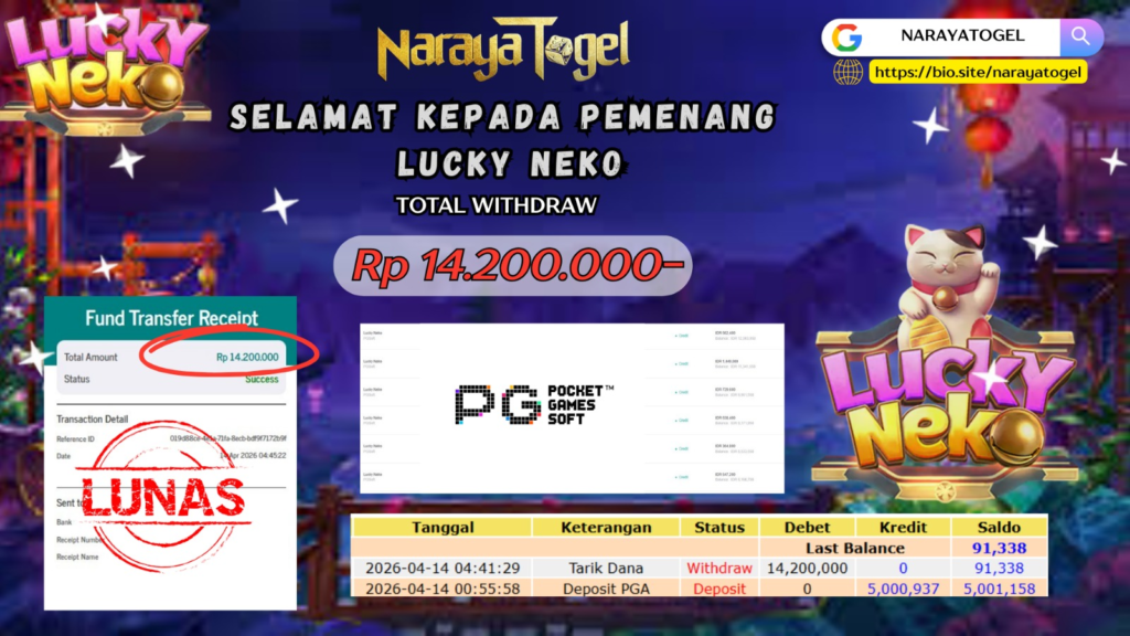 Selamat kepada User id TUTI** Telah berhasil mendapatkan kemenangan besar pada permainan SLOT LUCKY NEKO Dengan kemenangan Sebesar Rp 14.200.000 Setelah mengisi formulir withdraw dengan kurang waktu hanya 1 – 10 menit pihak NARAYATOGEL sudah melakukan transfer kepada pemiliknya dan dana sudah masuk ke rekening id tersebut oleh pemenang. Bukti pembayaran yang kami berikan merupakan bukti pembayaran yang SAH / VALID yang langsung di dapatkan melalui tanda transfer transaksi berhasil dari Bank yang di tuju.