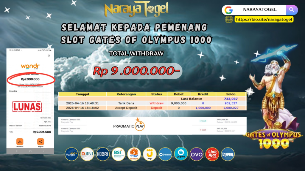 Selamat kepada User ID POP** Telah berhasil mendapatkan kemenangan besar pada permainan SLOT GATES OF OLYMPUS 1000 Dengan kemenangan Sebesar Rp 9.000.000 Setelah mengisi formulir withdraw dengan kurang waktu hanya 1 – 10 menit pihak NARAYATOGEL sudah melakukan transfer kepada pemiliknya dan dana sudah masuk ke rekening id tersebut oleh pemenang. Bukti pembayaran yang kami berikan merupakan bukti pembayaran yang SAH / VALID yang langsung di dapatkan melalui tanda transfer transaksi berhasil dari Bank yang di tuju.