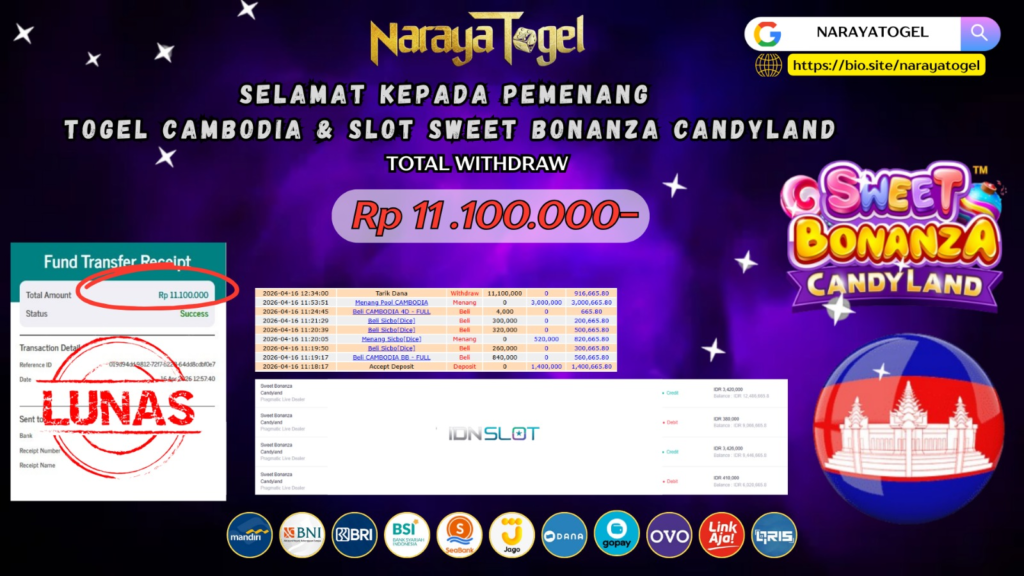 Selamat kepada User id SYUR** Telah berhasil mendapatkan kemenangan besar pada permainan TOGEL CAMBODIA & SLOT SWEET BONANZA CANDYLAND Dengan kemenangan Sebesar Rp 11.100.000 Setelah mengisi formulir withdraw dengan kurang waktu hanya 1 – 10 menit pihak NARAYATOGEL sudah melakukan transfer kepada pemiliknya dan dana sudah masuk ke rekening id tersebut oleh pemenang. Bukti pembayaran yang kami berikan merupakan bukti pembayaran yang SAH / VALID yang langsung di dapatkan melalui tanda transfer transaksi berhasil dari Bank yang di tuju.