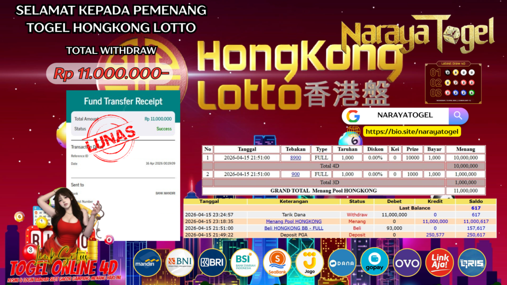 Selamat kepada User ID HARRI** Telah berhasil mendapatkan kemenangan besar pada permainan TOGEL HONGKONG LOTTO Dengan kemenangan Sebesar Rp 11.000.000 Setelah mengisi formulir withdraw dengan kurang waktu hanya 1 – 10 menit pihak NARAYATOGEL sudah melakukan transfer kepada pemiliknya dan dana sudah masuk ke rekening id tersebut oleh pemenang. Bukti pembayaran yang kami berikan merupakan bukti pembayaran yang SAH / VALID yang langsung di dapatkan melalui tanda transfer transaksi berhasil dari Bank yang di tuju.