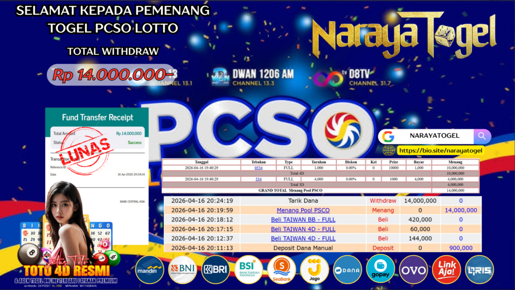 Selamat kepada User ID LOTE** Telah berhasil mendapatkan kemenangan besar pada permainan TOGEL PCSO LOTTO Dengan kemenangan Sebesar  Rp 14.000.000 Setelah mengisi formulir withdraw dengan kurang waktu hanya 1 – 10 menit pihak NARAYATOGEL sudah melakukan transfer kepada pemiliknya dan dana sudah masuk ke rekening id tersebut oleh pemenang. Bukti pembayaran yang kami berikan merupakan bukti pembayaran yang SAH / VALID yang langsung di dapatkan melalui tanda transfer transaksi berhasil dari Bank yang di tuju.