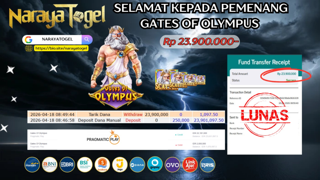 Selamat kepada User ID HERM** Telah berhasil mendapatkan kemenangan besar pada permainan GATES OF OLYMPUS Dengan kemenangan Sebesar Rp 23.900.000 Setelah mengisi formulir withdraw dengan kurang waktu hanya 1 – 10 menit pihak NARAYATOGEL sudah melakukan transfer kepada pemiliknya dan dana sudah masuk ke rekening id tersebut oleh pemenang. Bukti pembayaran yang kami berikan merupakan bukti pembayaran yang SAH / VALID yang langsung di dapatkan melalui tanda transfer transaksi berhasil dari Bank yang di tuju.