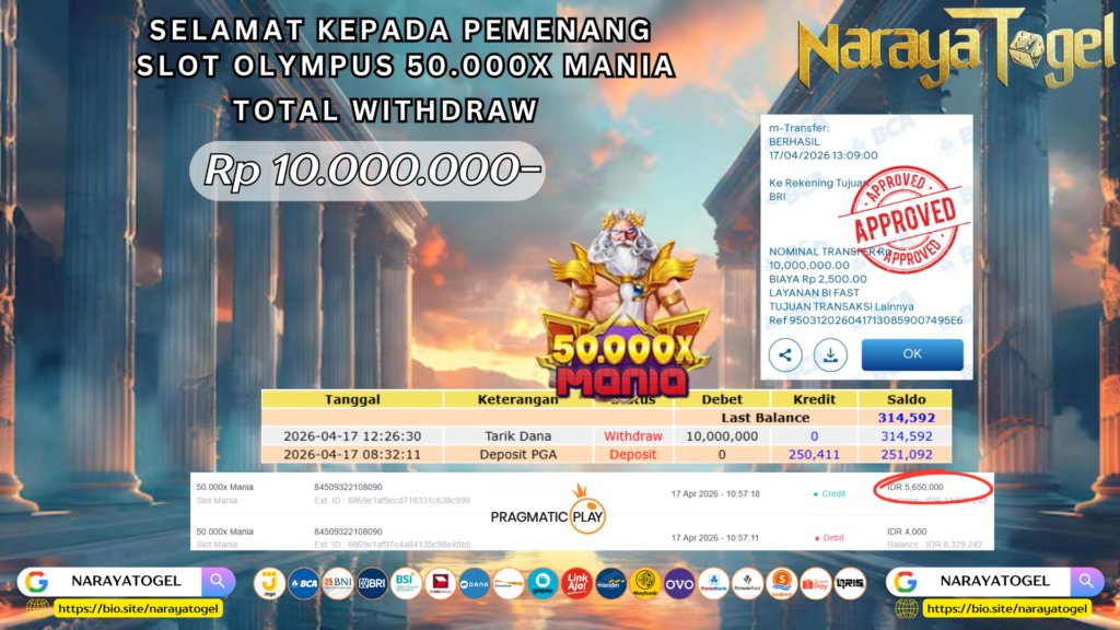 Selamat kepada User id RARE** Telah berhasil mendapatkan kemenangan besar pada permainan SLOT OLYMPUS 50.000X MANIA Dengan kemenangan Sebesar  Rp 10.000.000 Setelah mengisi formulir withdraw dengan kurang waktu hanya 1 – 10 menit pihak NARAYATOGEL sudah melakukan transfer kepada pemiliknya dan dana sudah masuk ke rekening id tersebut oleh pemenang. Bukti pembayaran yang kami berikan merupakan bukti pembayaran yang SAH / VALID yang langsung di dapatkan melalui tanda transfer transaksi berhasil dari Bank yang di tuju.