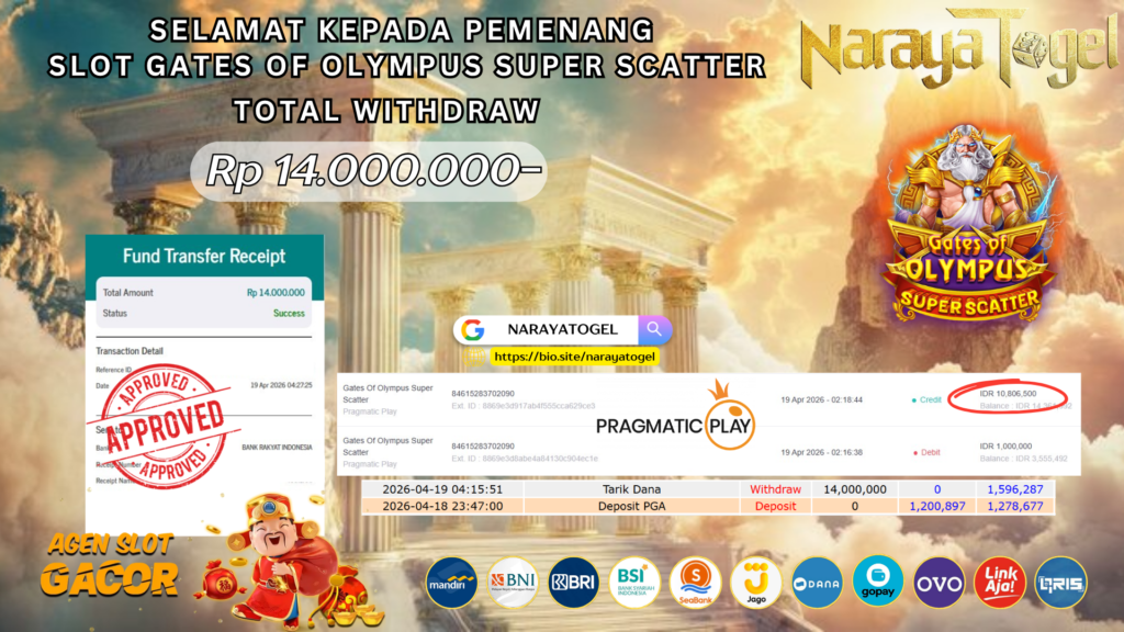 Selamat kepada User id KOKE** Telah berhasil mendapatkan kemenangan besar pada permainan SLOT GATES OF OLYMPUS SUPER SCATTER Dengan kemenangan Sebesar Rp 14.000.000 Setelah mengisi formulir withdraw dengan kurang waktu hanya 1 – 10 menit pihak NARAYATOGEL sudah melakukan transfer kepada pemiliknya dan dana sudah masuk ke rekening id tersebut oleh pemenang. Bukti pembayaran yang kami berikan merupakan bukti pembayaran yang SAH / VALID yang langsung di dapatkan melalui tanda transfer transaksi berhasil dari Bank yang di tuju.