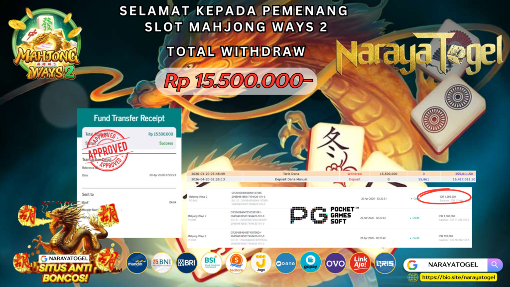 Selamat kepada User id REKSI** Telah berhasil mendapatkan kemenangan besar pada permainan SLOT MAHJONG WAYS 2 Dengan kemenangan Sebesar Rp 15.500.000 Setelah mengisi formulir withdraw dengan kurang waktu hanya 1 – 10 menit pihak NARAYATOGEL sudah melakukan transfer kepada pemiliknya dan dana sudah masuk ke rekening id tersebut oleh pemenang. Bukti pembayaran yang kami berikan merupakan bukti pembayaran yang SAH / VALID yang langsung di dapatkan melalui tanda transfer transaksi berhasil dari Bank yang di tuju.