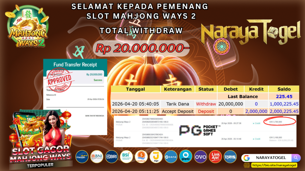 Selamat kepada User ID BUTTET** Telah berhasil mendapatkan kemenangan besar pada permainan SLOT MAHJONG WAYS 2 Dengan kemenangan Sebesar  Rp 20.000.000 Setelah mengisi formulir withdraw dengan kurang waktu hanya 1 – 10 menit pihak NARAYATOGEL sudah melakukan transfer kepada pemiliknya dan dana sudah masuk ke rekening id tersebut oleh pemenang. Bukti pembayaran yang kami berikan merupakan bukti pembayaran yang SAH / VALID yang langsung di dapatkan melalui tanda transfer transaksi berhasil dari Bank yang di tuju.