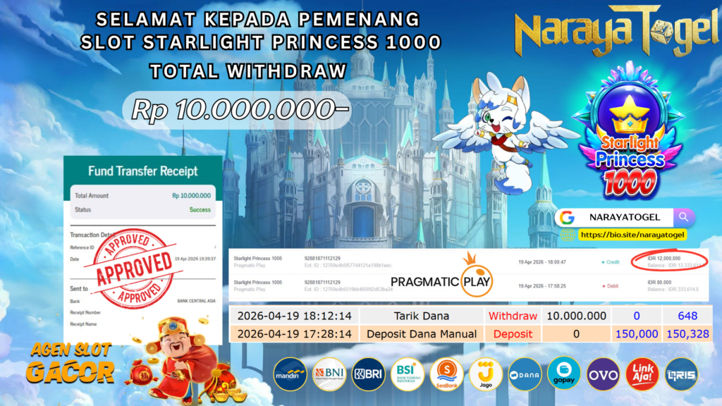 Selamat kepada User id RAFLI** Telah berhasil mendapatkan kemenangan besar pada permainan SLOT STARLIGHT PRINCESS 1000 Dengan kemenangan Sebesar Rp 10.000.000 Setelah mengisi formulir withdraw dengan kurang waktu hanya 1 – 10 menit pihak NARAYATOGEL sudah melakukan transfer kepada pemiliknya dan dana sudah masuk ke rekening id tersebut oleh pemenang. Bukti pembayaran yang kami berikan merupakan bukti pembayaran yang SAH / VALID yang langsung di dapatkan melalui tanda transfer transaksi berhasil dari Bank yang di tuju.