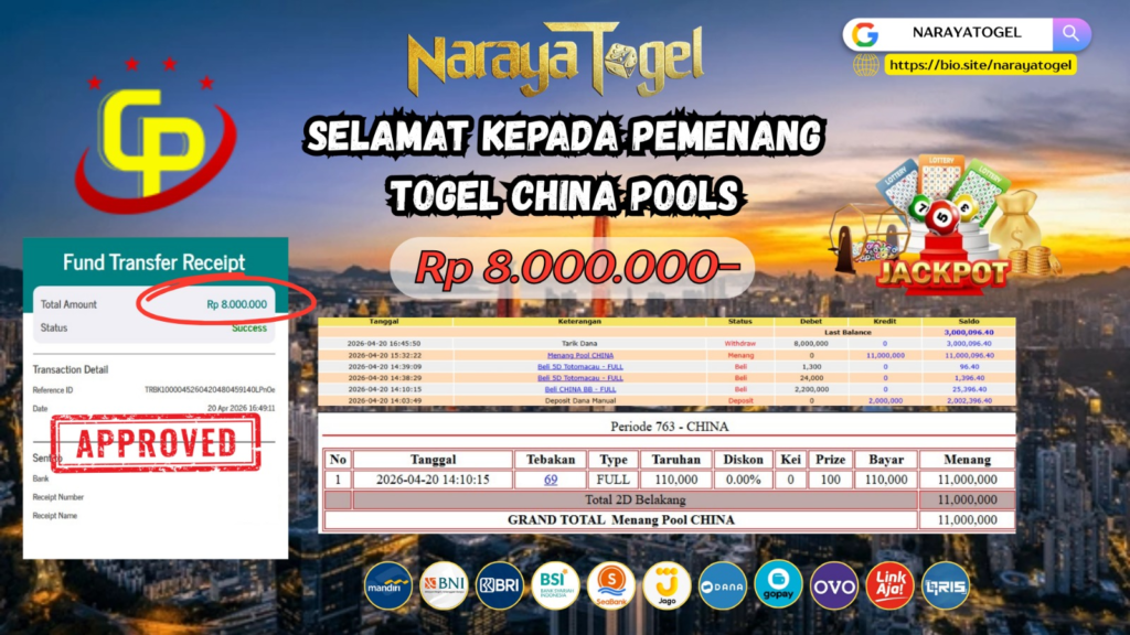 Selamat kepada User id SIO** Telah berhasil mendapatkan kemenangan besar pada permainan TOGEL CHINA POOLS Dengan kemenangan Sebesar Rp 8.000.000 Setelah mengisi formulir withdraw dengan kurang waktu hanya 1 – 10 menit pihak NARAYATOGEL sudah melakukan transfer kepada pemiliknya dan dana sudah masuk ke rekening id tersebut oleh pemenang. Bukti pembayaran yang kami berikan merupakan bukti pembayaran yang SAH / VALID yang langsung di dapatkan melalui tanda transfer transaksi berhasil dari Bank yang di tuju.
