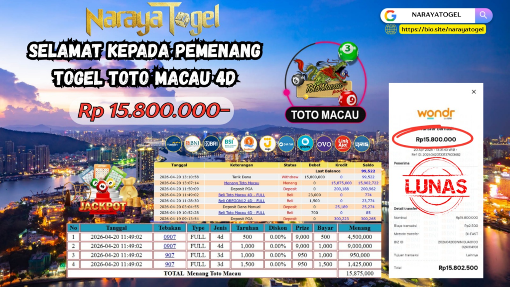 Masih ragu dengan NARAYA TOGEL bos ? Di mana bandar togel online sekarang yang terpercaya seperti NARAYATOGEL ? Bandar yang mengirimkan kemenangan member tanpa bertele – tele. Jadi…. tidak perlu khawatir pada situs NARAYA TOGEL karena kemenangan anda berapapun akan dibayarakan hingga lunas kepada pemenang.