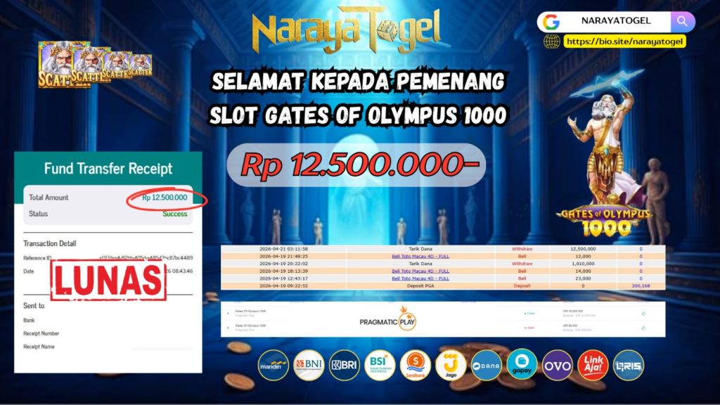Selamat kepada User ID SER** Telah berhasil mendapatkan kemenangan besar pada permainan SLOT GATES OF OLYMPUS 1000 Dengan kemenangan Sebesar Rp 12.500.000 Setelah mengisi formulir withdraw dengan kurang waktu hanya 1 – 10 menit pihak NARAYATOGEL sudah melakukan transfer kepada pemiliknya dan dana sudah masuk ke rekening id tersebut oleh pemenang. Bukti pembayaran yang kami berikan merupakan bukti pembayaran yang SAH / VALID yang langsung di dapatkan melalui tanda transfer transaksi berhasil dari Bank yang di tuju.