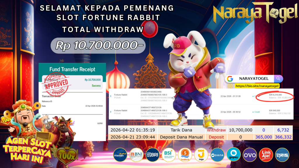 Selamat kepada User id UDI** Telah berhasil mendapatkan kemenangan besar pada permainan JACKPOT SLOT FORTUNE RABBIT Dengan kemenangan Sebesar Rp 10.700.000 Setelah mengisi formulir withdraw dengan kurang waktu hanya 1 – 10 menit pihak NARAYATOGEL sudah melakukan transfer kepada pemiliknya dan dana sudah masuk ke rekening id tersebut oleh pemenang. Bukti pembayaran yang kami berikan merupakan bukti pembayaran yang SAH / VALID yang langsung di dapatkan melalui tanda transfer transaksi berhasil dari Bank yang di tuju.
