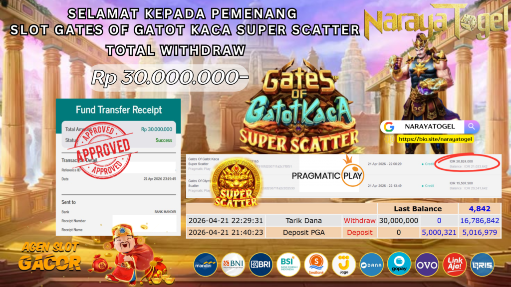 Selamat kepada User ID IJAH** Telah berhasil mendapatkan kemenangan besar pada permainan JACKPOT SLOT GATES OF GATOT KACA SUPER SCATTER Dengan kemenangan Sebesar Rp 30.000.000 Setelah mengisi formulir withdraw dengan kurang waktu hanya 1 – 10 menit pihak NARAYATOGEL sudah melakukan transfer kepada pemiliknya dan dana sudah masuk ke rekening id tersebut oleh pemenang. Bukti pembayaran yang kami berikan merupakan bukti pembayaran yang SAH / VALID yang langsung di dapatkan melalui tanda transfer transaksi berhasil dari Bank yang di tuju.