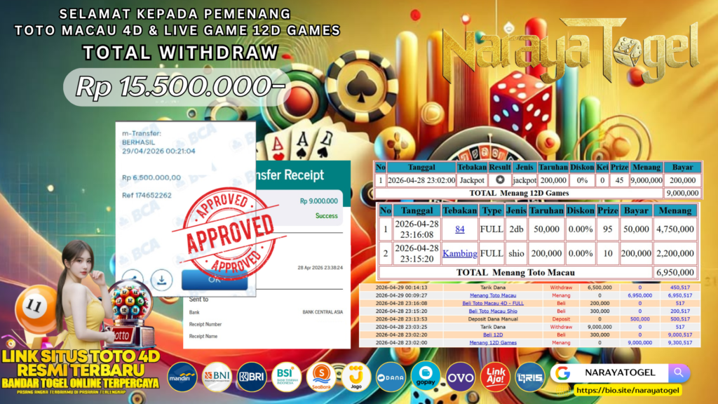 Selamat kepada User ID YUTI** Telah berhasil mendapatkan kemenangan besar pada permainan LIVE GAME 12D GAMES & TOTO MACAU 4D Dengan kemenangan Sebesar Rp 15.500.000 Setelah mengisi formulir withdraw dengan kurang waktu hanya 1 – 10 menit pihak NARAYATOGEL sudah melakukan transfer kepada pemiliknya dan dana sudah masuk ke rekening id tersebut oleh pemenang. Bukti pembayaran yang kami berikan merupakan bukti pembayaran yang SAH / VALID yang langsung di dapatkan melalui tanda transfer transaksi berhasil dari Bank yang di tuju.