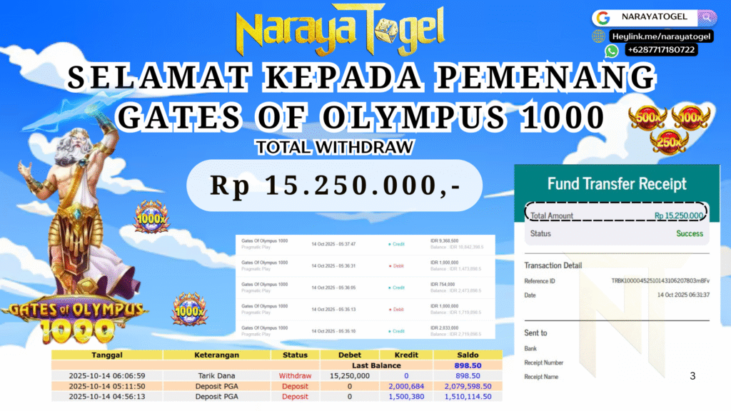 Selamat kepada User id MEL*****Telah berhasil mendapatkan kemenangan besar pada permainan  SLOT GATES OF OLYMPUS 1000   Dengan kemenangan Sebesar  Rp 15.250.000 Setelah mengisi formulir withdraw dengan kurang waktu hanya 1 – 10 menit pihak NARAYATOGEL sudah melakukan transfer kepada pemiliknya dan dana sudah masuk ke rekening id tersebut oleh pemenang. Bukti pembayaran yang kami berikan merupakan bukti pembayaran yang SAH / VALID yang langsung di dapatkan melalui tanda transfer transaksi berhasil dari Bank yang di tuju.