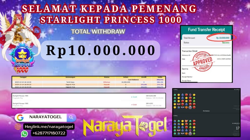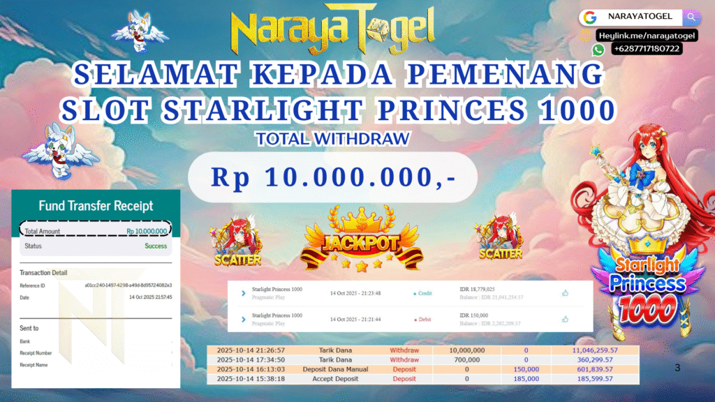 Selamat kepada User id KOP*****Telah berhasil mendapatkan kemenangan besar pada permainan  STARLIGT PRINCESS 1000   Dengan kemenangan Sebesar  Rp 10.000.000 Setelah mengisi formulir withdraw dengan kurang waktu hanya 1 – 10 menit pihak NARAYATOGEL sudah melakukan transfer kepada pemiliknya dan dana sudah masuk ke rekening id tersebut oleh pemenang. Bukti pembayaran yang kami berikan merupakan bukti pembayaran yang SAH / VALID yang langsung di dapatkan melalui tanda transfer transaksi berhasil dari Bank yang di tuju.