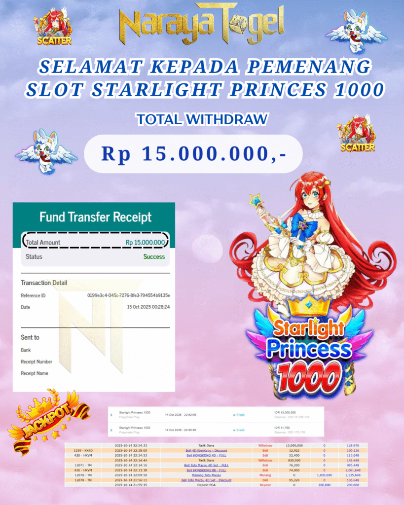 Selamat kepada User id GUN*****Telah berhasil mendapatkan kemenangan besar pada permainan  STARLIGT PRINCESS 1000   Dengan kemenangan Sebesar  Rp 15.000.000 Setelah mengisi formulir withdraw dengan kurang waktu hanya 1 – 10 menit pihak NARAYATOGEL sudah melakukan transfer kepada pemiliknya dan dana sudah masuk ke rekening id tersebut oleh pemenang. Bukti pembayaran yang kami berikan merupakan bukti pembayaran yang SAH / VALID yang langsung di dapatkan melalui tanda transfer transaksi berhasil dari Bank yang di tuju.