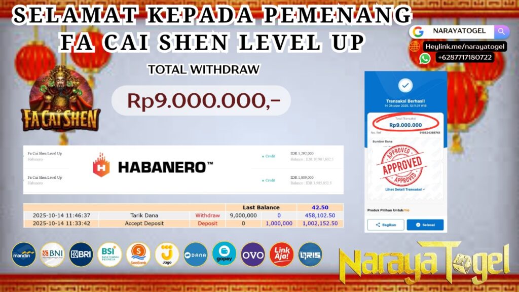 Selamat kepada User id HOP*****Telah berhasil mendapatkan kemenangan besar pada permainan  FA CAI SHEN LEVEL UP   Dengan kemenangan Sebesar  Rp 9.000.000 Setelah mengisi formulir withdraw dengan kurang waktu hanya 1 – 10 menit pihak NARAYATOGEL sudah melakukan transfer kepada pemiliknya dan dana sudah masuk ke rekening id tersebut oleh pemenang. Bukti pembayaran yang kami berikan merupakan bukti pembayaran yang SAH / VALID yang langsung di dapatkan melalui tanda transfer transaksi berhasil dari Bank yang di tuju.