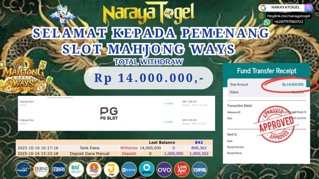 Selamat kepada User id GOP*****Telah berhasil mendapatkan kemenangan besar pada permainan  SLOT MAHJONG WAYS   Dengan kemenangan Sebesar  Rp 14.000.000 Setelah mengisi formulir withdraw dengan kurang waktu hanya 1 – 10 menit pihak NARAYATOGEL sudah melakukan transfer kepada pemiliknya dan dana sudah masuk ke rekening id tersebut oleh pemenang. Bukti pembayaran yang kami berikan merupakan bukti pembayaran yang SAH / VALID yang langsung di dapatkan melalui tanda transfer transaksi berhasil dari Bank yang di tuju.