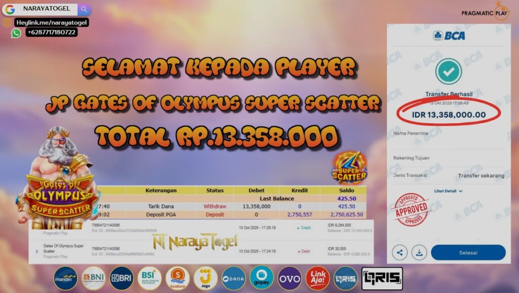 Selamat kepada User id ROS***Telah berhasil mendapatkan kemenangan besar pada permainan  SLOT GATES OF OLYMPUS SUPER SCATTER   Dengan kemenangan Sebesar  Rp13.358.000 Setelah mengisi formulir withdraw dengan kurang waktu hanya 1 – 10 menit pihak NARAYATOGEL sudah melakukan transfer kepada pemiliknya dan dana sudah masuk ke rekening id tersebut oleh pemenang. Bukti pembayaran yang kami berikan merupakan bukti pembayaran yang SAH / VALID yang langsung di dapatkan melalui tanda transfer transaksi berhasil dari Bank yang di tuju.