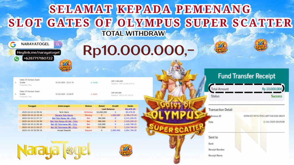 Selamat kepada User id OCU*****Telah berhasil mendapatkan kemenangan besar pada permainan  GATES OF OLYMPUS SUPER SCATTER   Dengan kemenangan Sebesar  Rp 10.000.000 Setelah mengisi formulir withdraw dengan kurang waktu hanya 1 – 10 menit pihak NARAYATOGEL sudah melakukan transfer kepada pemiliknya dan dana sudah masuk ke rekening id tersebut oleh pemenang. Bukti pembayaran yang kami berikan merupakan bukti pembayaran yang SAH / VALID yang langsung di dapatkan melalui tanda transfer transaksi berhasil dari Bank yang di tuju.