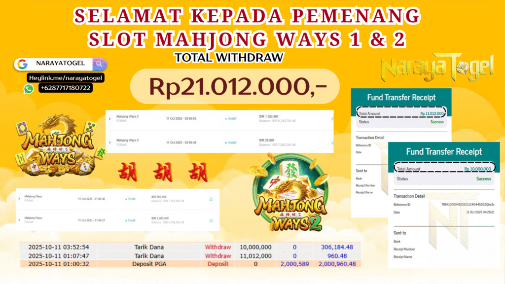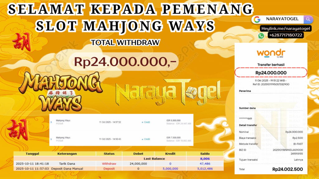 Selamat kepada User id BAL*****Telah berhasil mendapatkan kemenangan besar pada permainan  SLOT MAHJONG WAYS 1 & 2   Dengan kemenangan Sebesar  Rp 21.012.000 Setelah mengisi formulir withdraw dengan kurang waktu hanya 1 – 10 menit pihak NARAYATOGEL sudah melakukan transfer kepada pemiliknya dan dana sudah masuk ke rekening id tersebut oleh pemenang. Bukti pembayaran yang kami berikan merupakan bukti pembayaran yang SAH / VALID yang langsung di dapatkan melalui tanda transfer transaksi berhasil dari Bank yang di tuju.