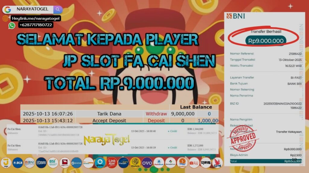 Selamat kepada User id PRE***Telah berhasil mendapatkan kemenangan besar pada permainan  SLOT FA CAI SHEN   Dengan kemenangan Sebesar  Rp9.000.000 Setelah mengisi formulir withdraw dengan kurang waktu hanya 1 – 10 menit pihak NARAYATOGEL sudah melakukan transfer kepada pemiliknya dan dana sudah masuk ke rekening id tersebut oleh pemenang. Bukti pembayaran yang kami berikan merupakan bukti pembayaran yang SAH / VALID yang langsung di dapatkan melalui tanda transfer transaksi berhasil dari Bank yang di tuju.