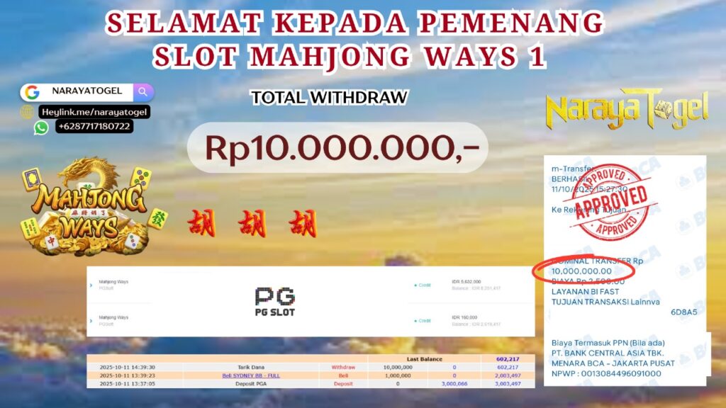 Selamat kepada User id gop****Telah berhasil mendapatkan kemenangan besar pada permainan  SLOT MAHJONG WAYS 1 Dengan kemenangan Sebesar  Rp 10.000.000 Setelah mengisi formulir withdraw dengan kurang waktu hanya 1 – 10 menit pihak NARAYATOGEL sudah melakukan transfer kepada pemiliknya dan dana sudah masuk ke rekening id tersebut oleh pemenang. Bukti pembayaran yang kami berikan merupakan bukti pembayaran yang SAH / VALID yang langsung di dapatkan melalui tanda transfer transaksi berhasil dari Bank yang di tuju.