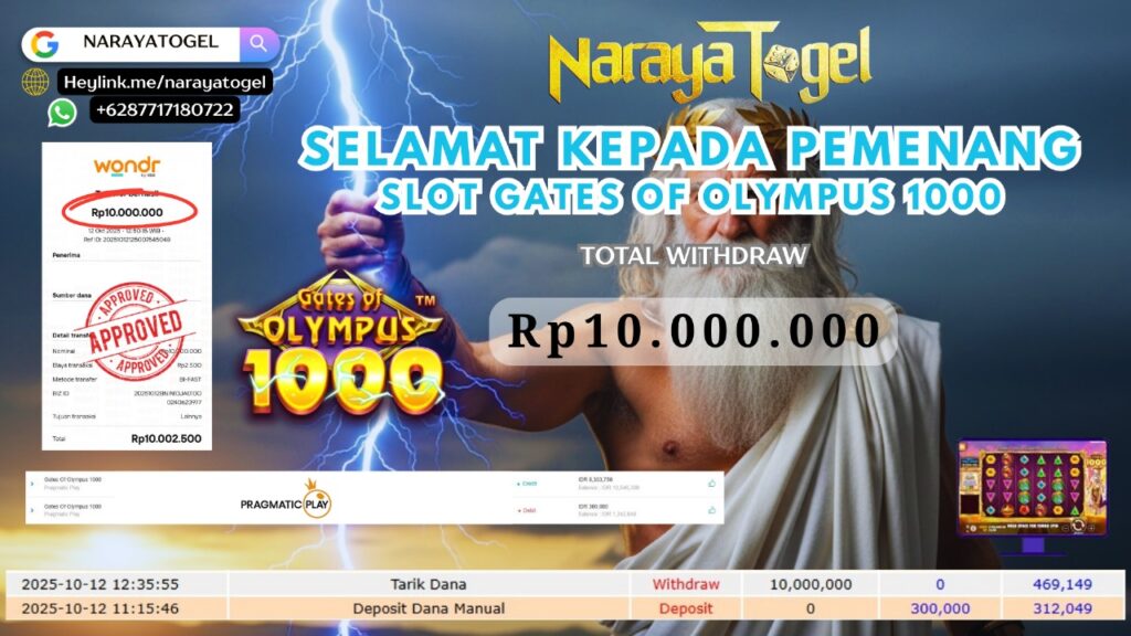 Selamat kepada User id GIU****Telah berhasil mendapatkan kemenangan besar pada permainan   SLOT GATES OF OLYMPUS 1000  Dengan kemenangan Sebesar  Rp10.000.000 Setelah mengisi formulir withdraw dengan kurang waktu hanya 1 – 10 menit pihak NARAYATOGEL sudah melakukan transfer kepada pemiliknya dan dana sudah masuk ke rekening id tersebut oleh pemenang. Bukti pembayaran yang kami berikan merupakan bukti pembayaran yang SAH / VALID yang langsung di dapatkan melalui tanda transfer transaksi berhasil dari Bank yang di tuju.
